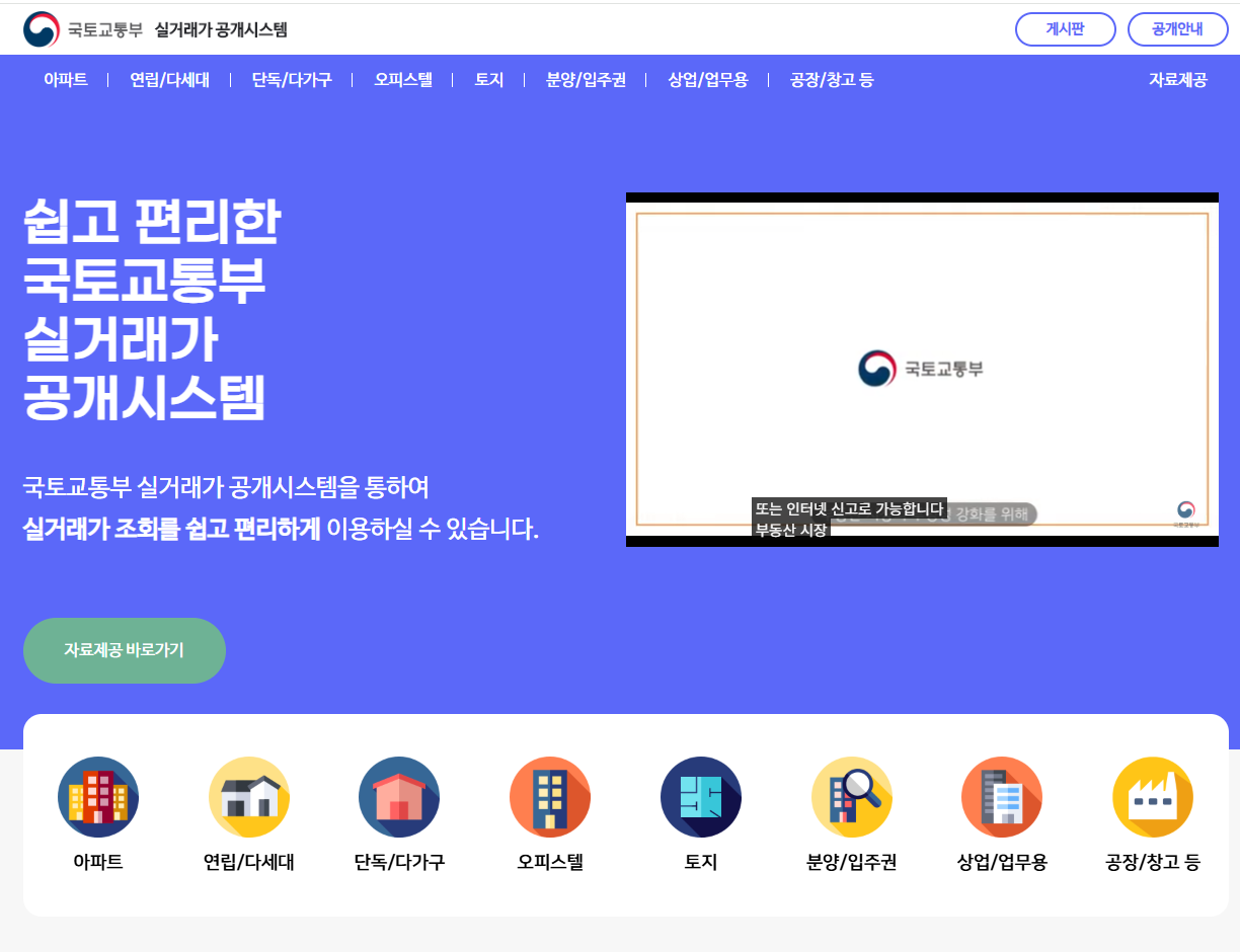 국토부 실거래가 공개시스템에서 상가, 토지, 오피스텔 등도 조회 가능합니다.